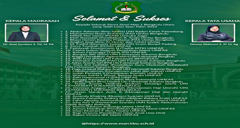 Sebanyak 36 orang siswa Madrasah Aliyah Negeri 1 Bengkulu Utara dinyatakan lulus dan diterima pada Seleksi Prestasi Akademik Nasional - Perguruan Tinggi Keagamaan Islam Negeri (SPAN-PTKIN) 2026 yang diumumkan pada Selasa (7/4/2026) melalui situs resmi website span.ptkin.ac.id. Ini merupakan prestasi yang membanggakan untuk pihak madrasah karena sebelumnya 6 siswa juga dinyatakan diterima di Perguruan Tinggi Negeri (PTN) melalui jalur SNBP.